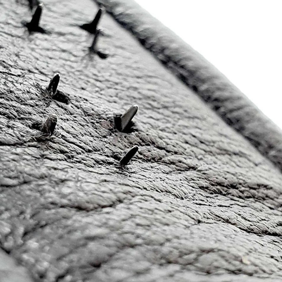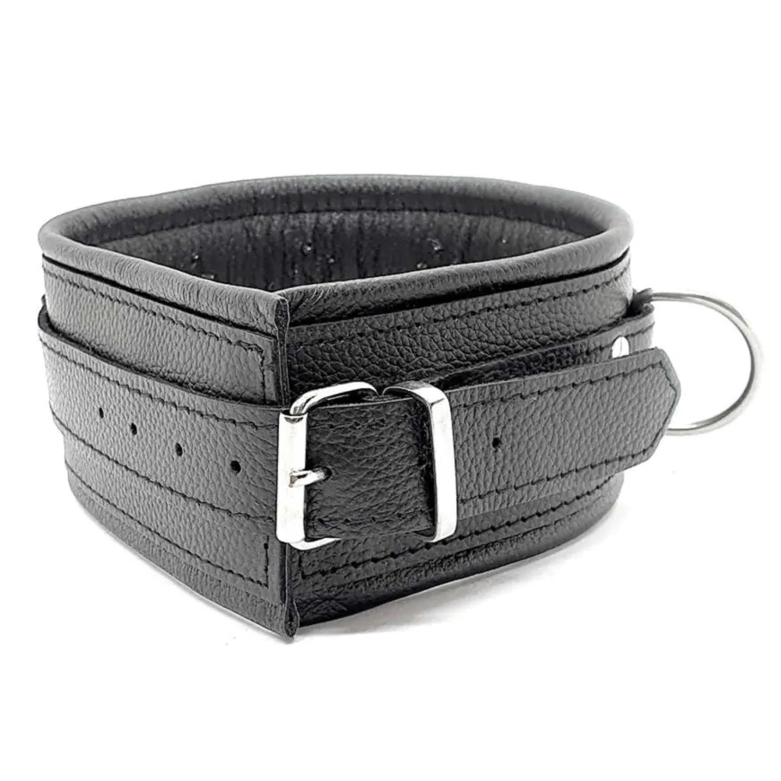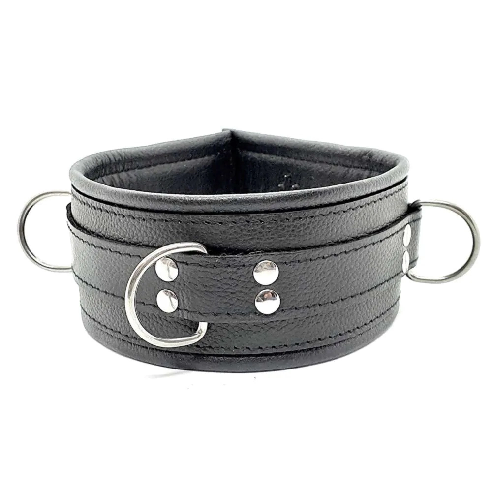 De leren halsband met spikes is gemaakt van drielaags gewatteerd genaaid leer en heeft drie D-ringen. De spikes zitten aan de binnenkant. Als u een riem aan de halsband bevestigt, is een lichte, korte ruk aan de riem voldoende en is de binnenkant van de halsband voelbaar. Zodra de slaaf het prikinzetstuk opmerkt, wordt hij vroom! Breedte kraag ca. 65 mm breed, kraaglengte ca. 45mm.