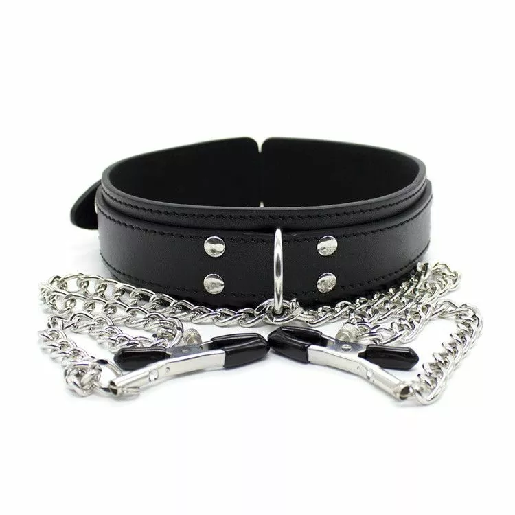 Real leather adjustable Black collar with D-Ring where 2 nipple clamps are connected by a steel chain.