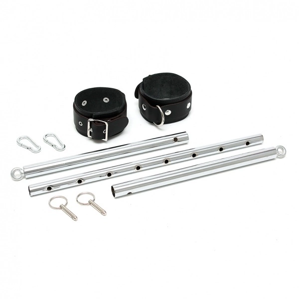Rimba Bondage Play, verstelbare zilver kleurige metalen spreidstang met zwarte echt tuig-lederen boeien verbonden met een karabijn haak. De stang is verstelbaar in lengte over 8 posities van 55 tot en met 85 cm lang.