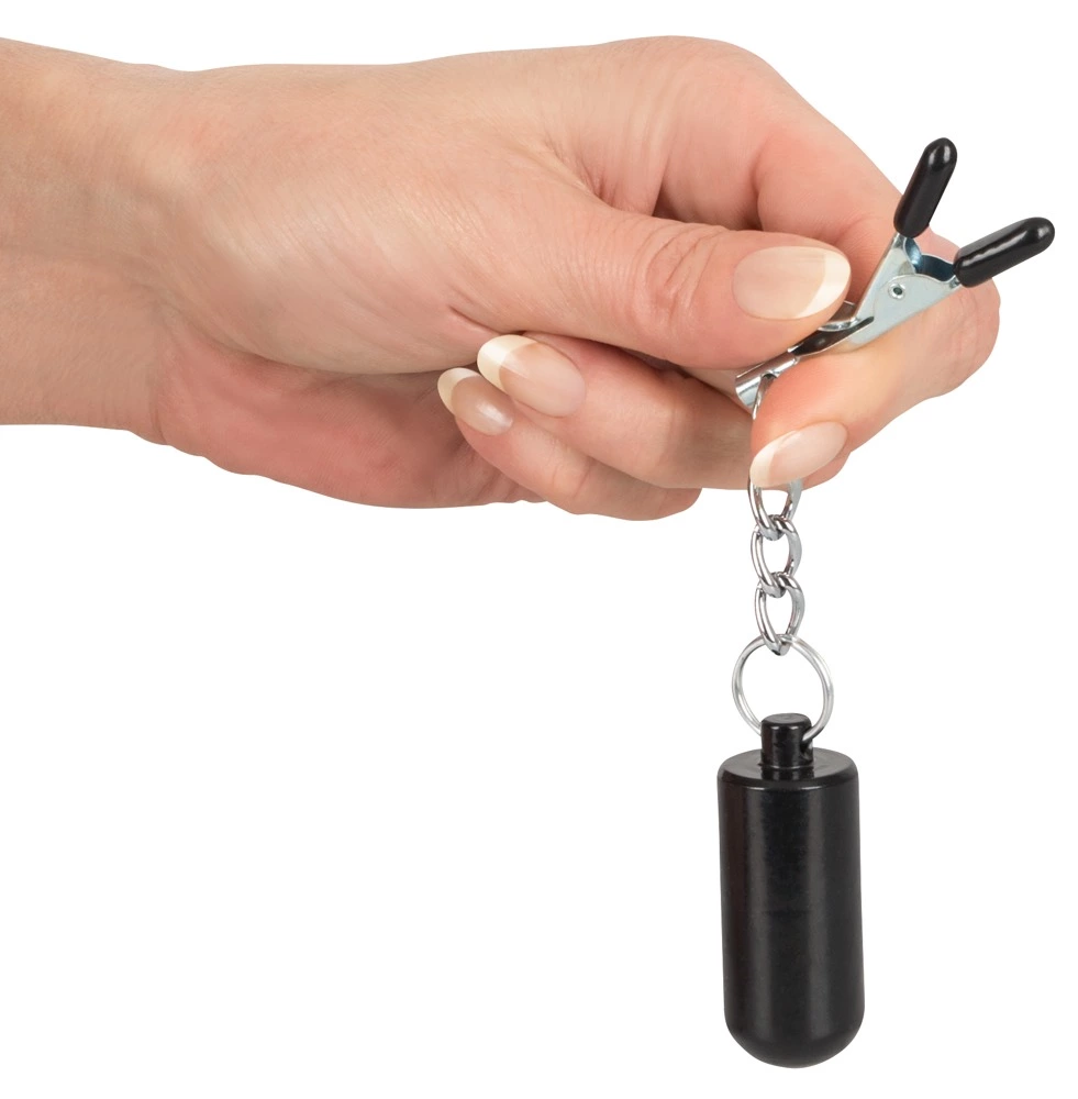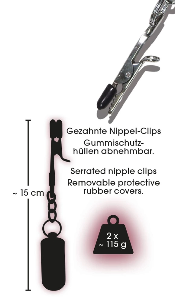 Deze zwart / zilver borst gewichten zien er geil uit en zorgen voor een spannend en tintelend draaggevoel. Met gekartelde zachte tepel clips onder de afneembare plastic hoesjes. Bijvoorbeeld ook te plaatsen op de schaamlippen en de testikels. 2 x 115 gram. Nikkelvrij!