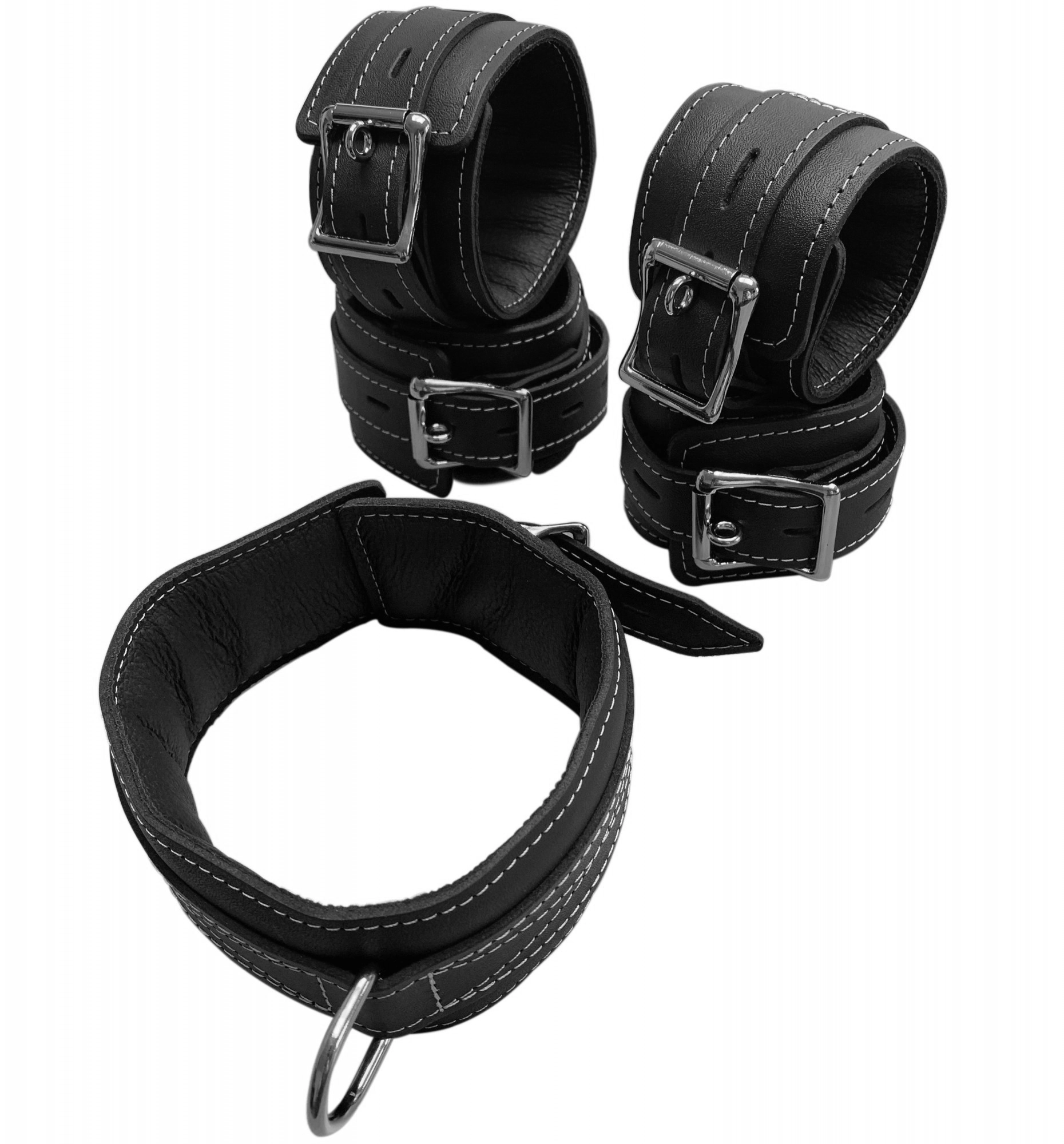 Lederen polsboeien, handboeien en halsband, gemaakt van glad soepel zwart leder, rondom geheel met wit garen afgestikt. Op de boei is een stevige rvs D-ring bevestigd.
