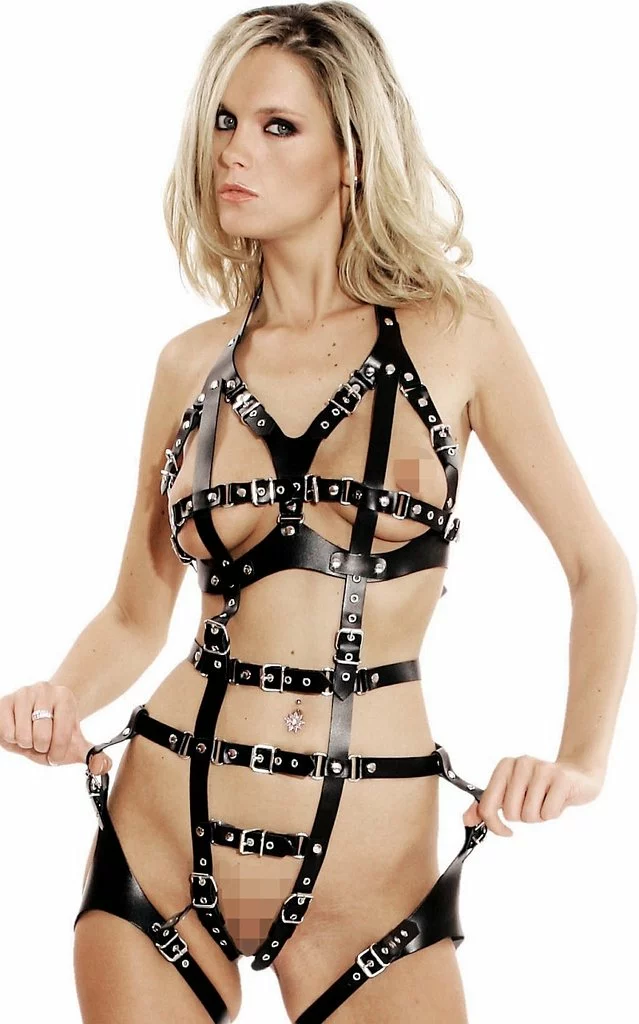 Cow split leather Harness strap body crotchless with thigh cuffs. Crotch straps and all straps adjustable with buckle fasteners.