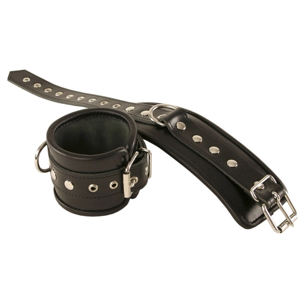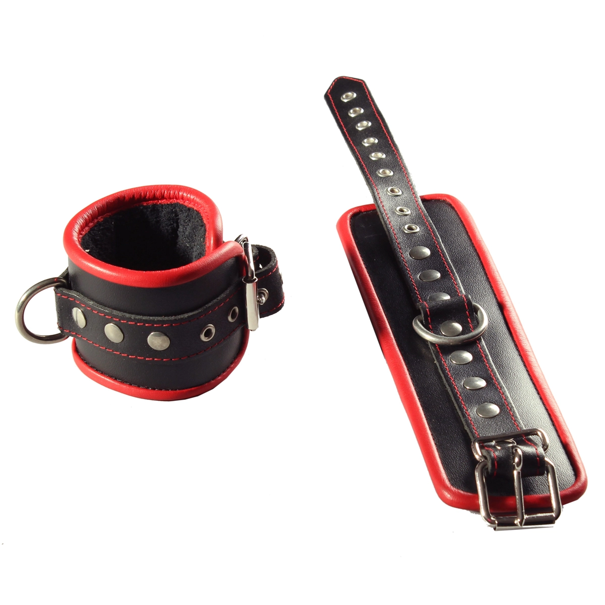 Mooi afgewerkte lederen polsboeien met stevige D-ringen en decoratieve studs. Verkrijgbaar in volledig zwarte en zwart-rode uitvoering. Een essentieel stuk in iedere BDSM en bondage fetisj collectie!