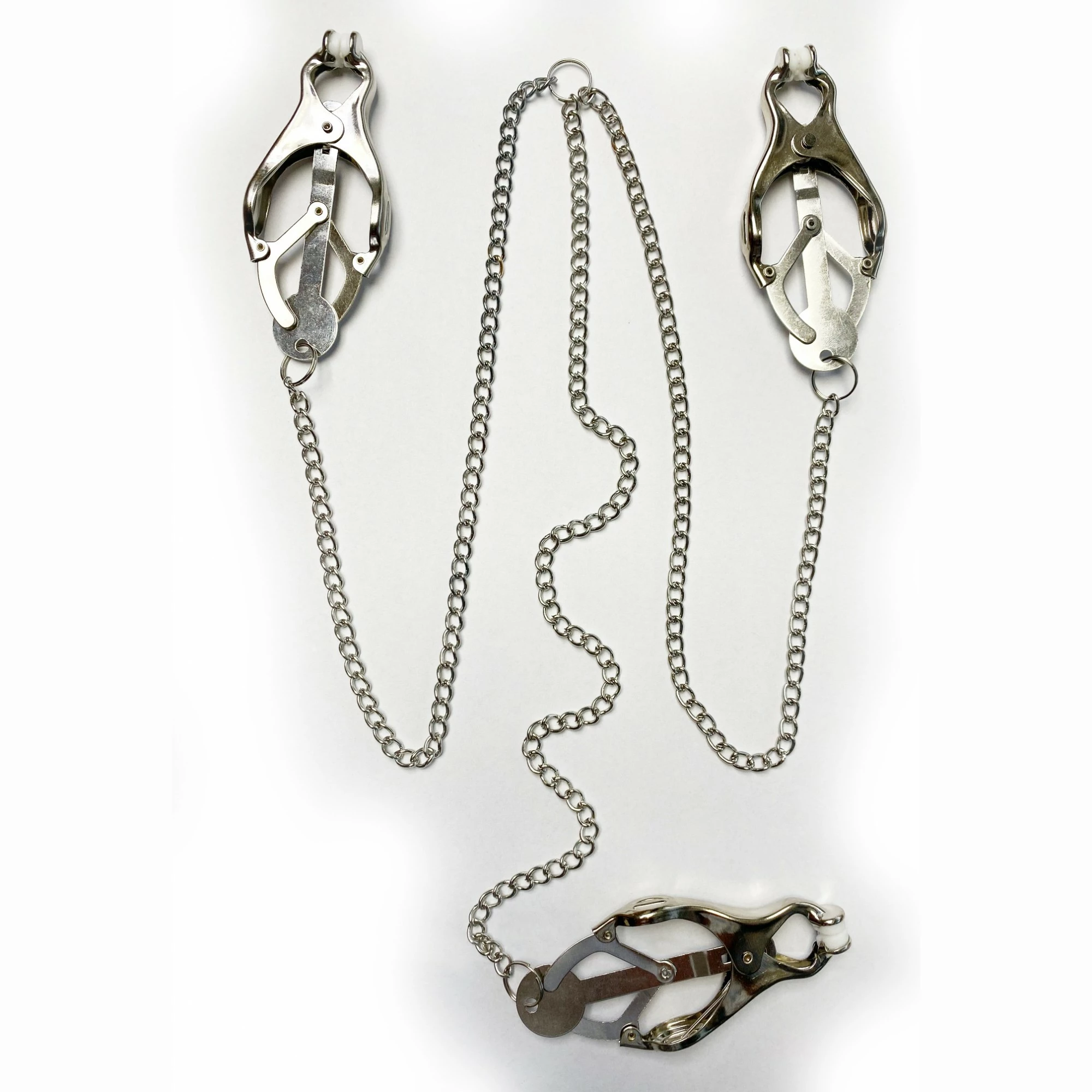 Verbindt haar meest gevoelige gebieden (Tepels – Clitoris) met elkaar. Deze ‘gemene klemmen gaan vaster zitten naarmate je er aan trekt. Metalen klemmen met rubberen dopjes op de plaats waar de tepel geklemd wordt.