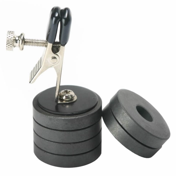 Similar in function to a clothespin, this individually sold nipple clip has vinyl coated tips and a thumbscrew for adjusting tension. Six removable 1 ounce magnetic weights can be used to vary gravity‘s pull.