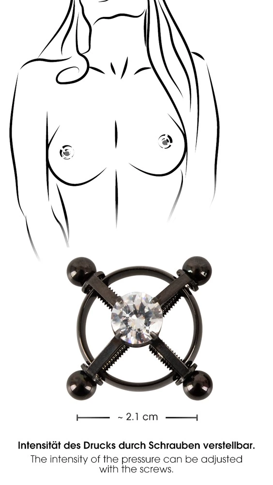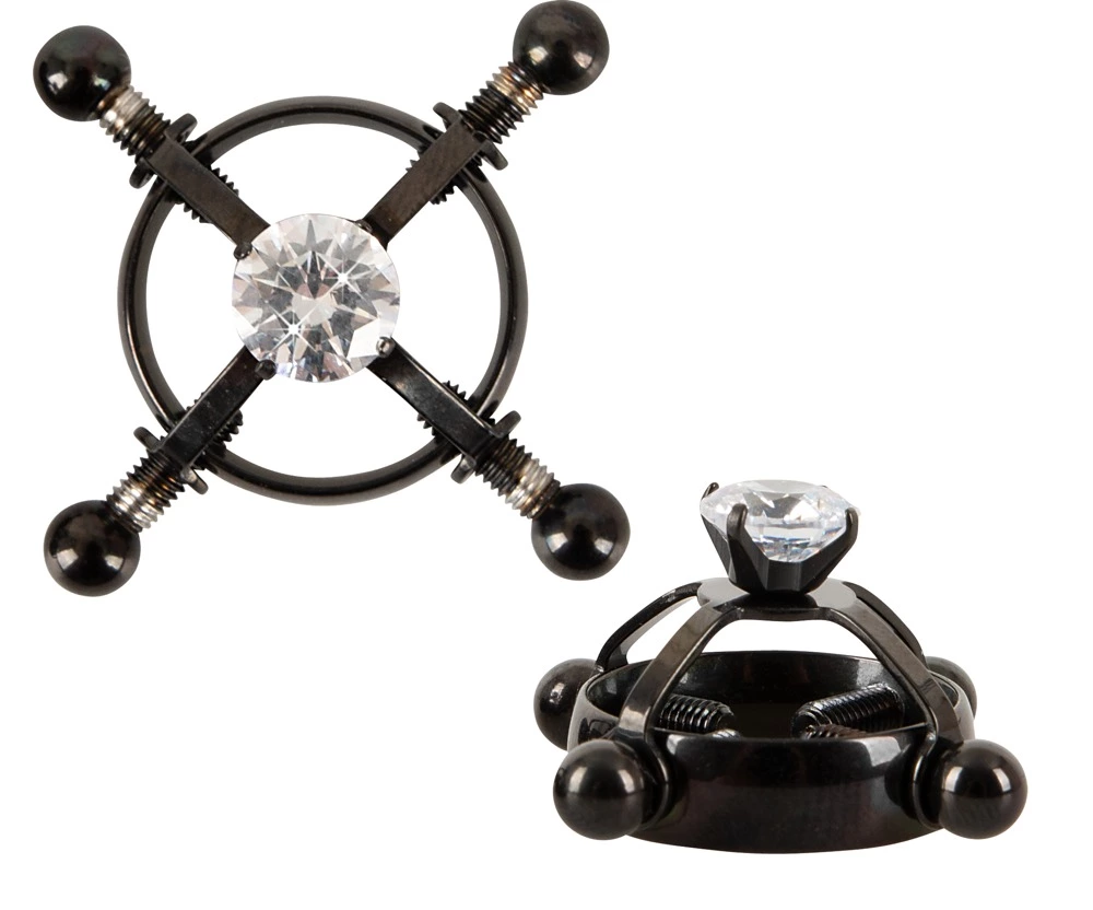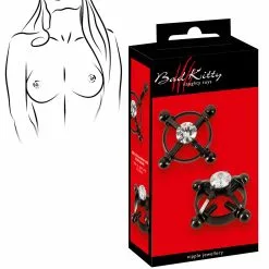 Deze twee extreem lichtgewicht tepelklemmen Nipple Jewellery Shiny Star van Bad Kitty knijpen in de tepels en zijn te verstellen met 4 schroeven. De sensatie varieert van zacht tot extreem opwindend. De uiterst elegante zwarte metalen klemmetjes hebben glanzende, decoratieve edelstenen in het midden en zien eruit als een echte piercing.