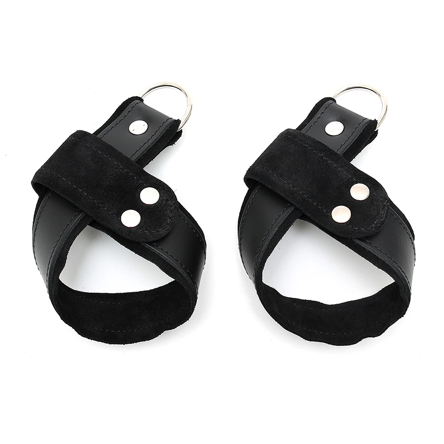 Rimba Bondage Play. Echt lederen handboeien in lus-vorm om te hangen, geleverd met 2 karabijn haken.