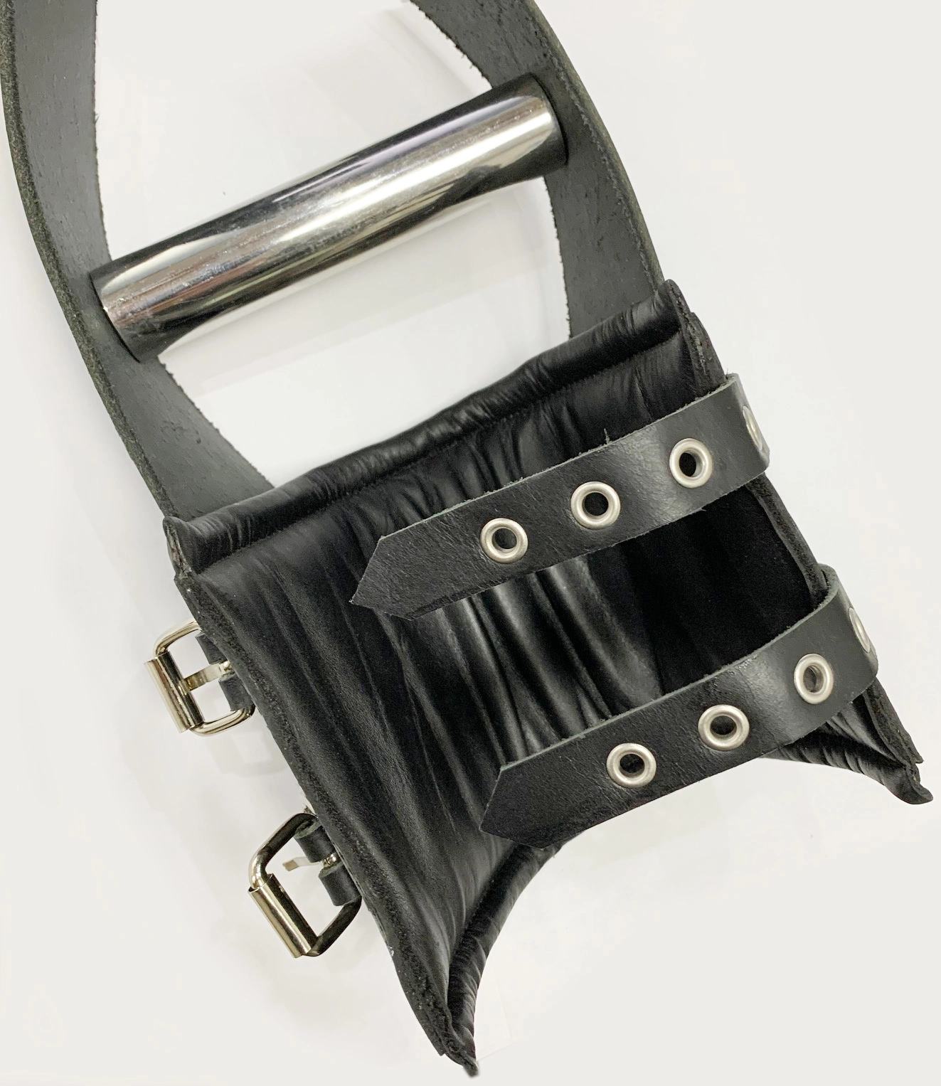 100% Lederen, prachtige Hangboeien met RVS handgrepen en dubbele riempjes. Geheel rondom gestikt en met leder afgebiesd.
