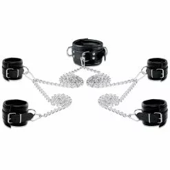 Zeer luxe Lederen boeienset, voorzien van hoogwaardig kwalitatieve ketting welke Hals- Pols- en Voetboeien met elkaar verbinden. De boeienset is uitgevoerd met prachtig zwart leder. De binnenzijde is bekleed met zacht zwart nappaleder zodat er geen metalen delen aan de binnenzijde zijn. Elke boei is voorzien van een stevige D-ring. Een prachtige boeienset van de allerbeste kwaliteit.