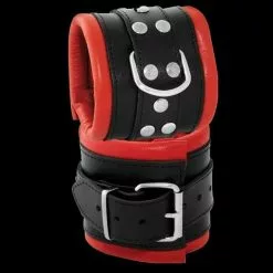 Zeer luxe zwart-rode enkelboeien van stevig rundleder met comfortabele zachte nappalederen voering en geen metalen delen aan de binnenzijde. Voorzien van stevige D-ring. Een prachtige polsboei van de allerbeste kwaliteit.