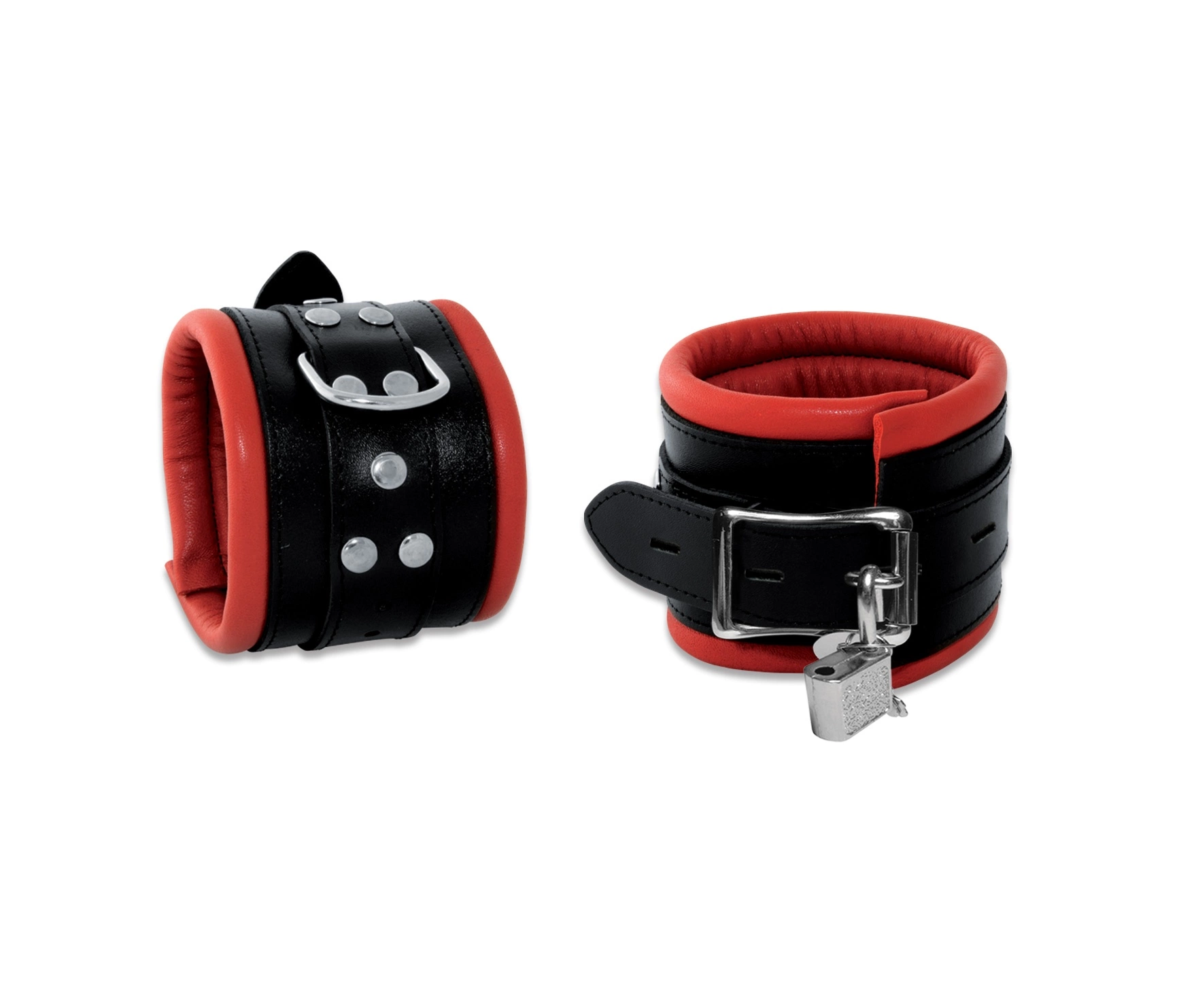Zeer luxe zwart-rode enkelboeien van stevig rundleder met comfortabele zachte nappalederen voering en geen metalen delen aan de binnenzijde. Voorzien van stevige D-ring. Een prachtige polsboei van de allerbeste kwaliteit.