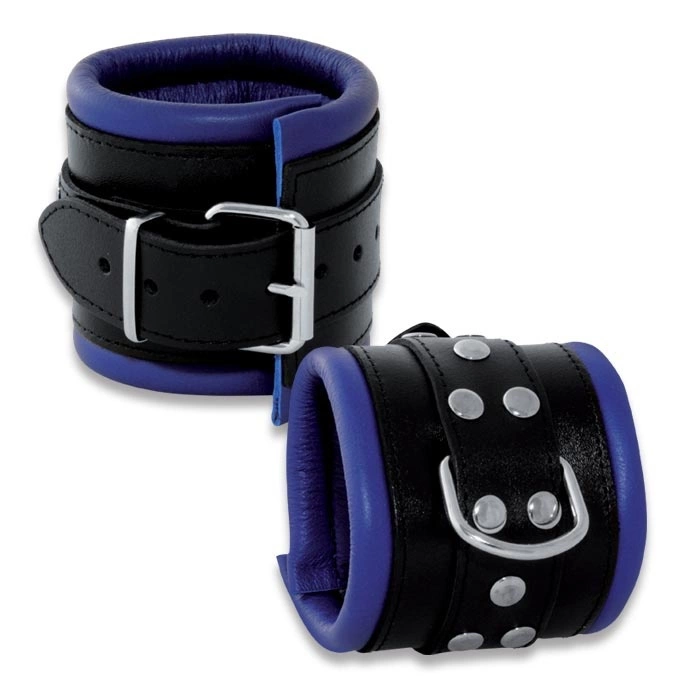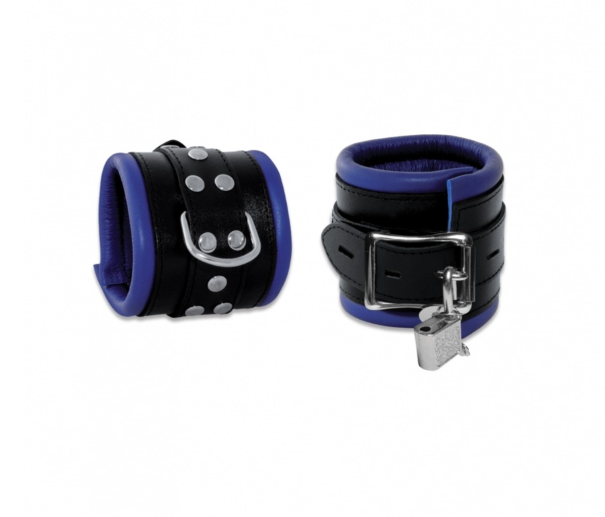 Stijvolle set top kwaliteit lederen polsboeien met aantrekkelijke blauwe voering, aflsuitbaar met de meegeleverde hangsloten en gepolsterd voor optimaal comfort tijdens jouw bondagesessies.
