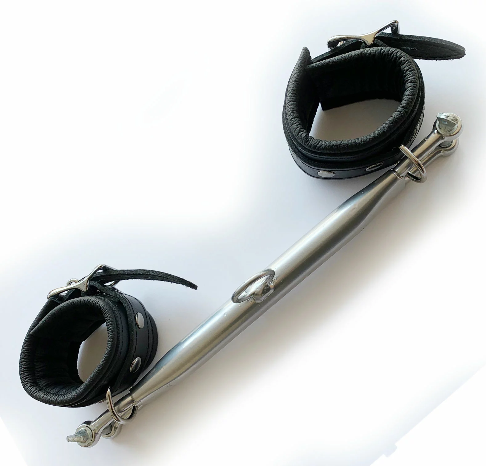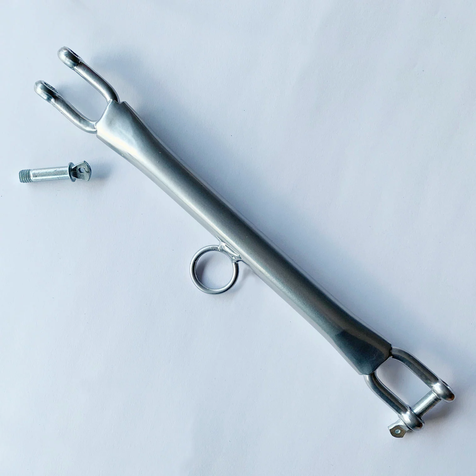 Houd uw subje gespreid in bondage. Deze 290 mm lange stalen spreader bar heeft in het midden een gelast oog voor een stevige bevestiging. De ogen aan beide uiteinden zijn middels een schroefdraad te openen om hand- of voetboeien aan te bevestigen.