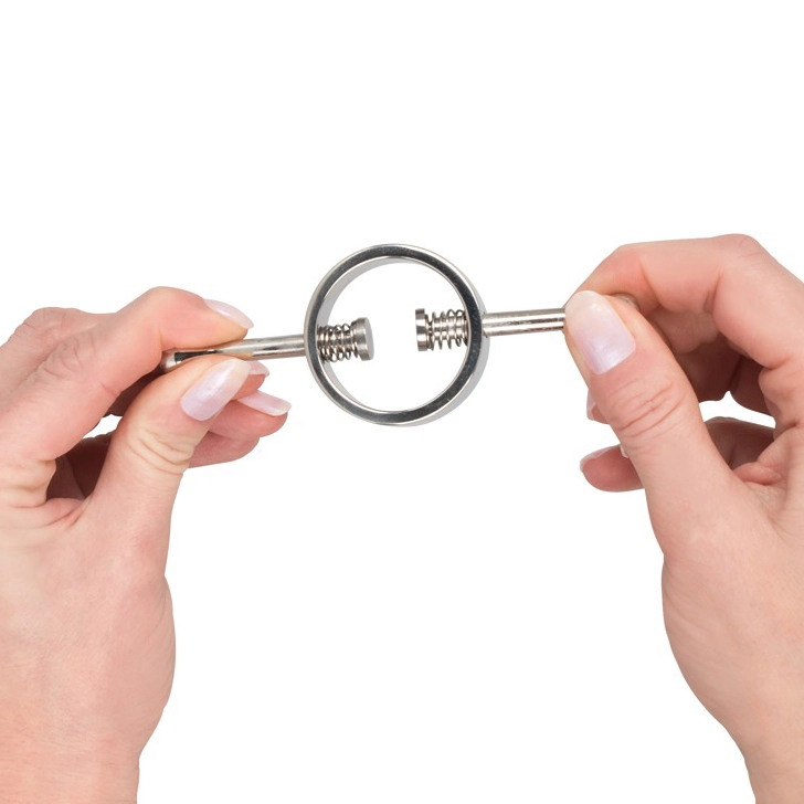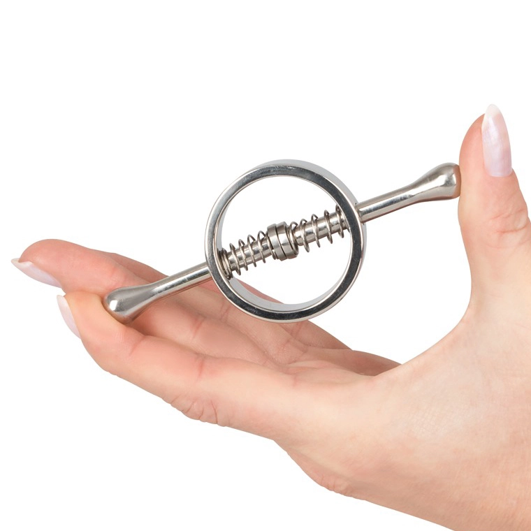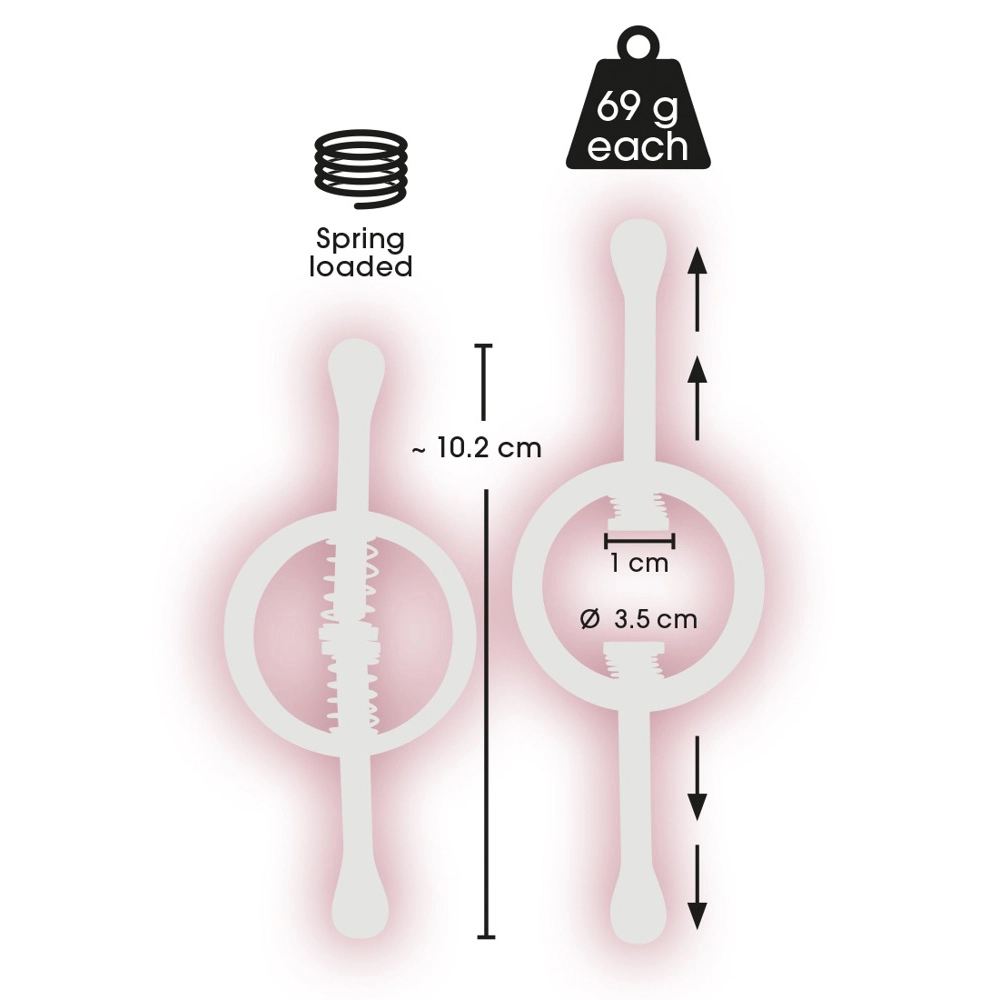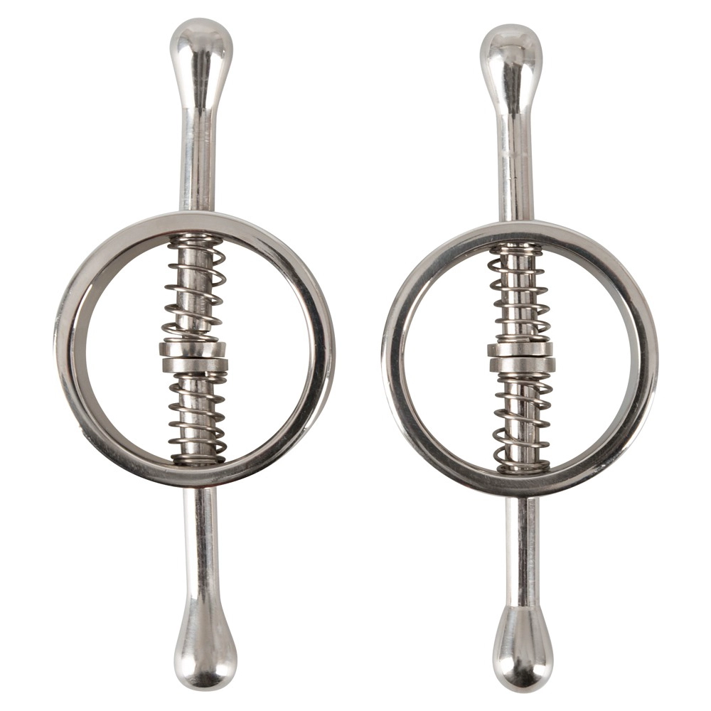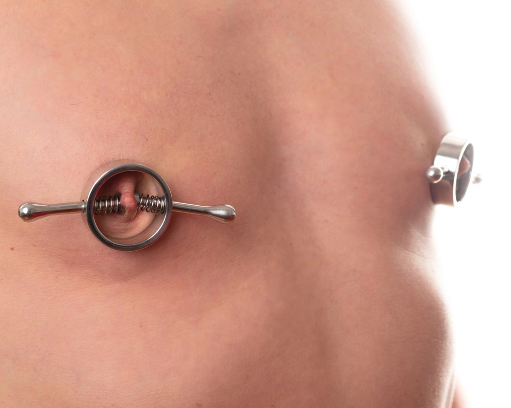 Tepelklemmen, die door middel van veren aan de tepels worden bevestigd. Gemakkelijk te bevestigen en elegant om te dragen. Dankzij de vering passen ze zich aan de tepels aan.