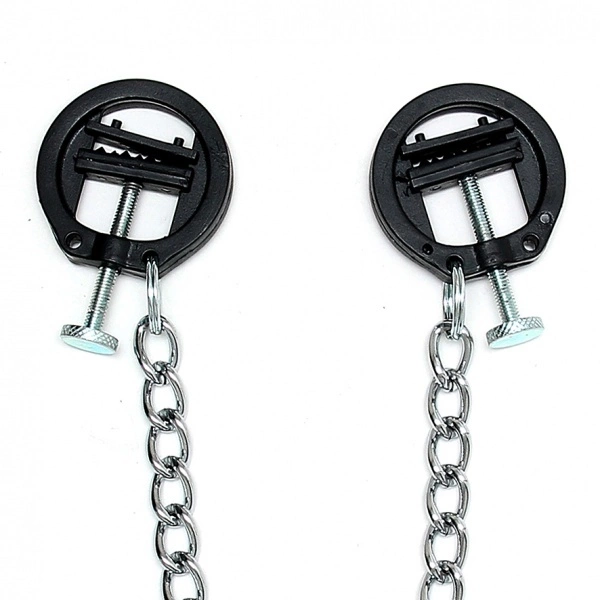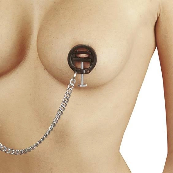 Deze lichtgewicht zwarte kunststof tepelklemmen kunnen zeer precies aangeschroefd worden naar wens (of juist niet :D) van de sub. Door het schroefwieltje aan te draaien kan de druk op de tepel aangepast worden en door de kunststof tandjes zullen de klemmetjes mooi op zijn plaats blijven. Daarnaast zorgen de tandjes ook nog voor een (on?)aangenaam effect. De klemmetjes worden als set geleverd en zijn middels de ring via een ketting aan elkaar verbonden