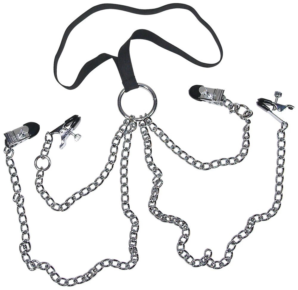 Chest harness with a ring, a stretchy neck strap and 4 chains (2 x 29 cm, 2 x 52 cm long) with nipple and labia clamps. Adjustable pressure. Material: polyamide, metal.