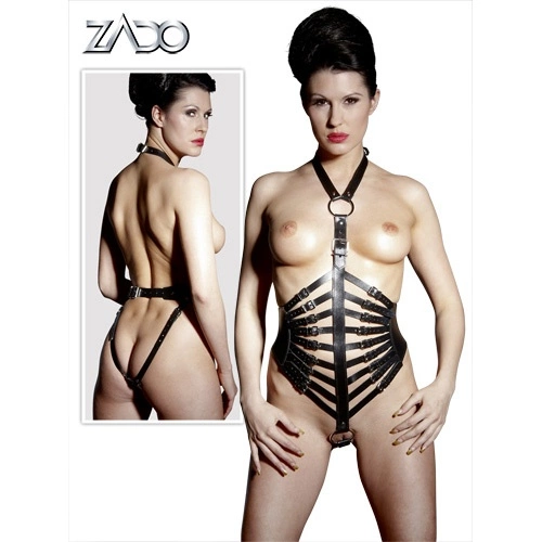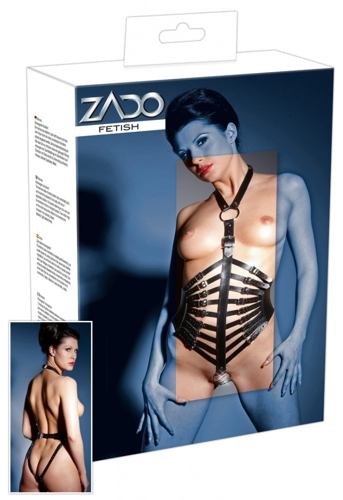 Zwart lederen harnas met meerdere gespen, voorzien van twee metalen ringen in het kruis (ontworpen voor een dildo, wordt niet meegeleverd). Materiaal: split leer, metaal.