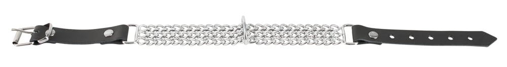 Stijlvolle lederen ketting collar, welke gemaakt is van 3 gepolijste metalen kettingen met D-Ring aan de voorzijde. De collar is verstelbaar middels een echt lederen, rondaom afgestikte riem met gesp.