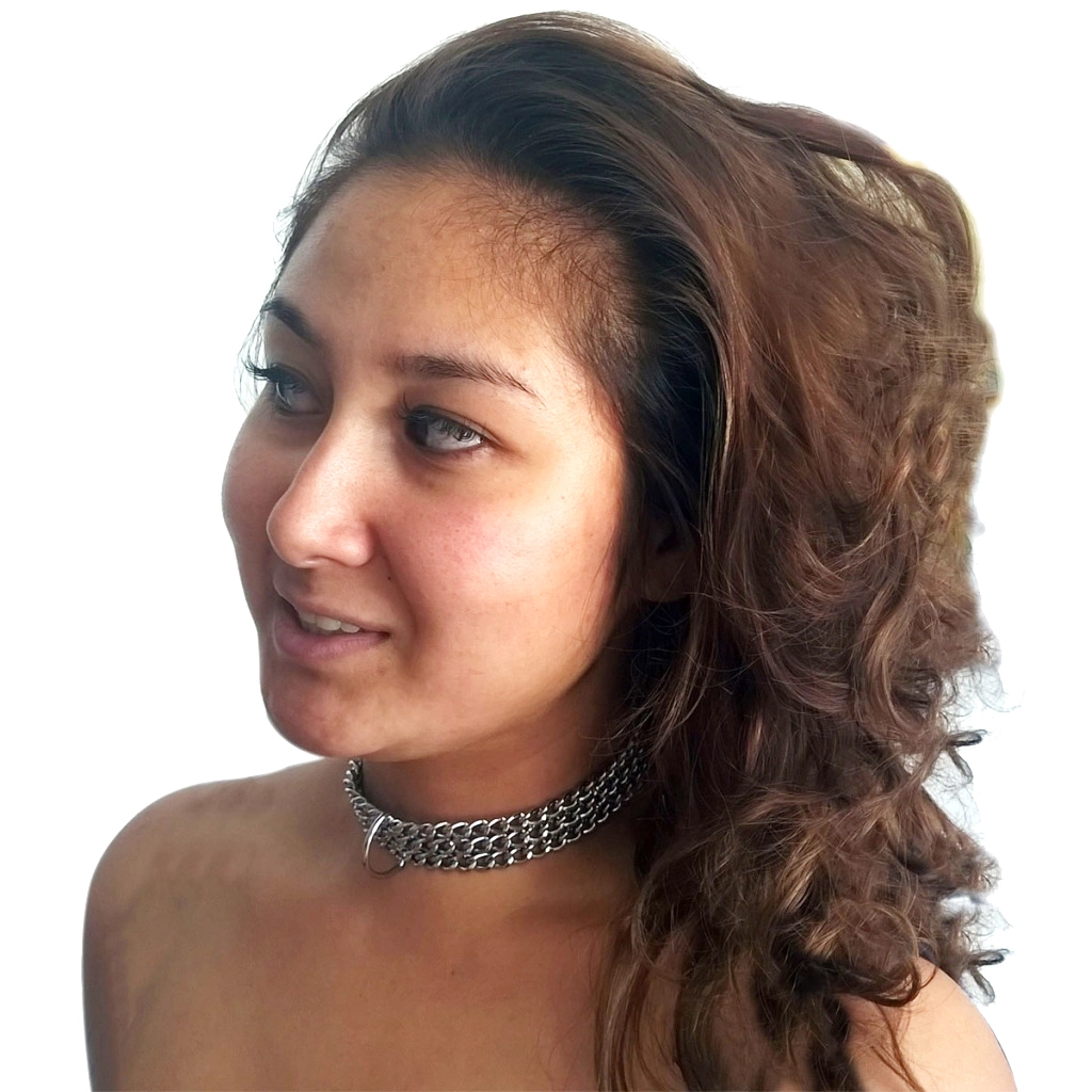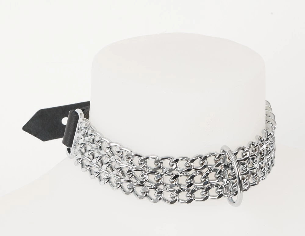 Stijlvolle lederen ketting collar, welke gemaakt is van 3 gepolijste metalen kettingen met D-Ring aan de voorzijde. De collar is verstelbaar middels een echt lederen, rondaom afgestikte riem met gesp.