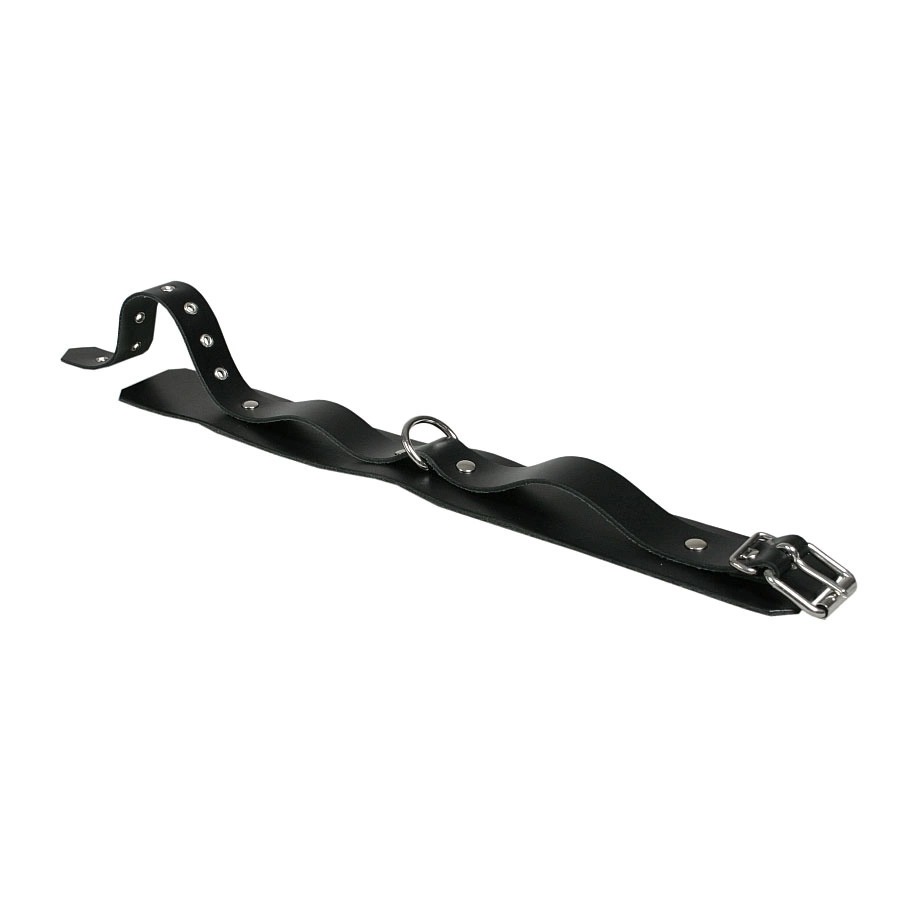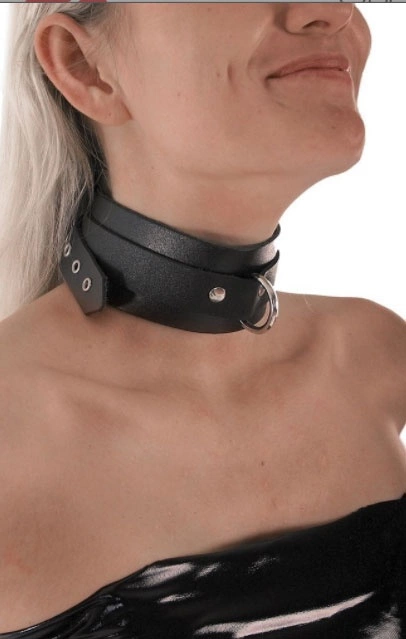 Zwart split lederen halsband ongeveer 5 cm breed met D-ring, met gesp sluiting verstelbaar.